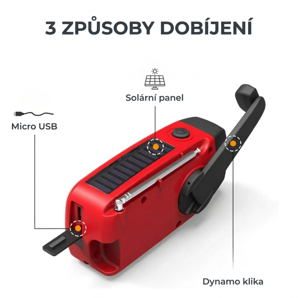 Umožňuje vám vyrábět vlastní energii, poslouchat rádio a mít k dispozici integrovanou LED svítilnu.