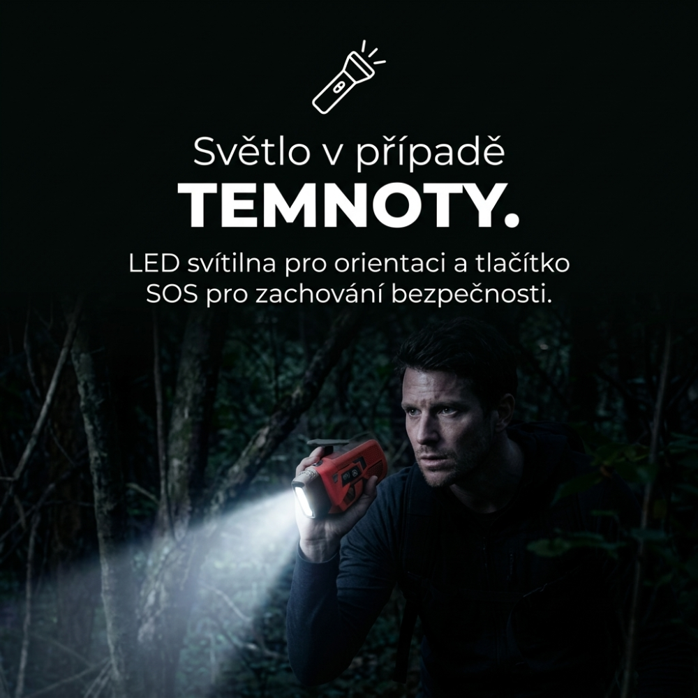 Zůstaňte informováni díky rádiu AM/FM a mějte k dispozici spolehlivý zdroj světla pro případ tmy, kdekoliv se nacházíte. Tlačítko SOS je také integrováno pro případ nouze.
